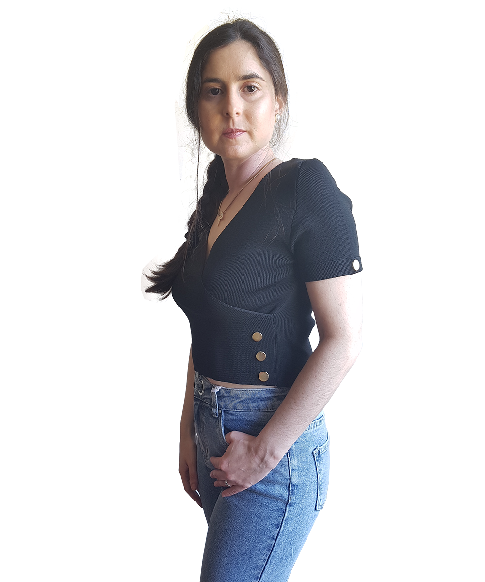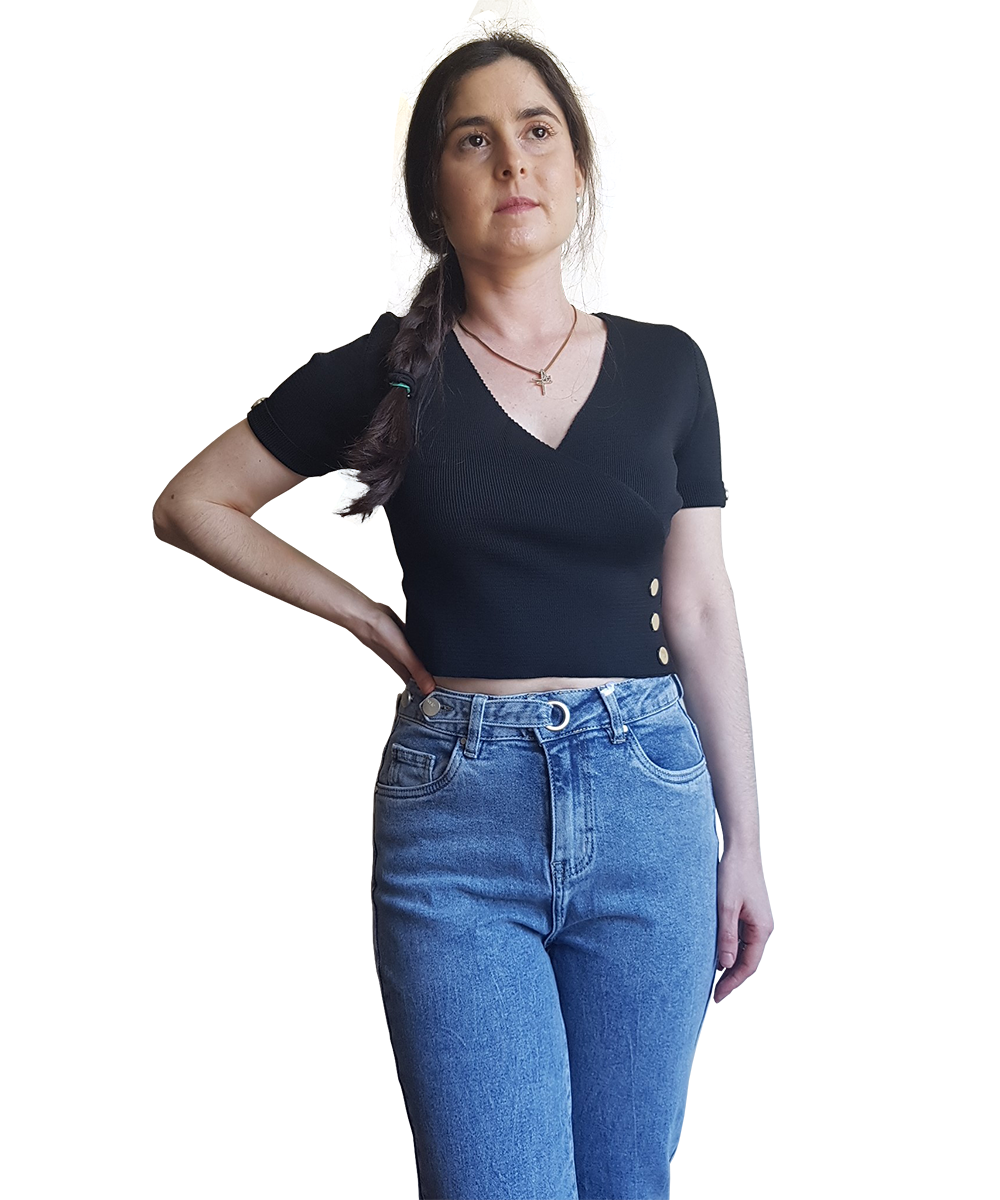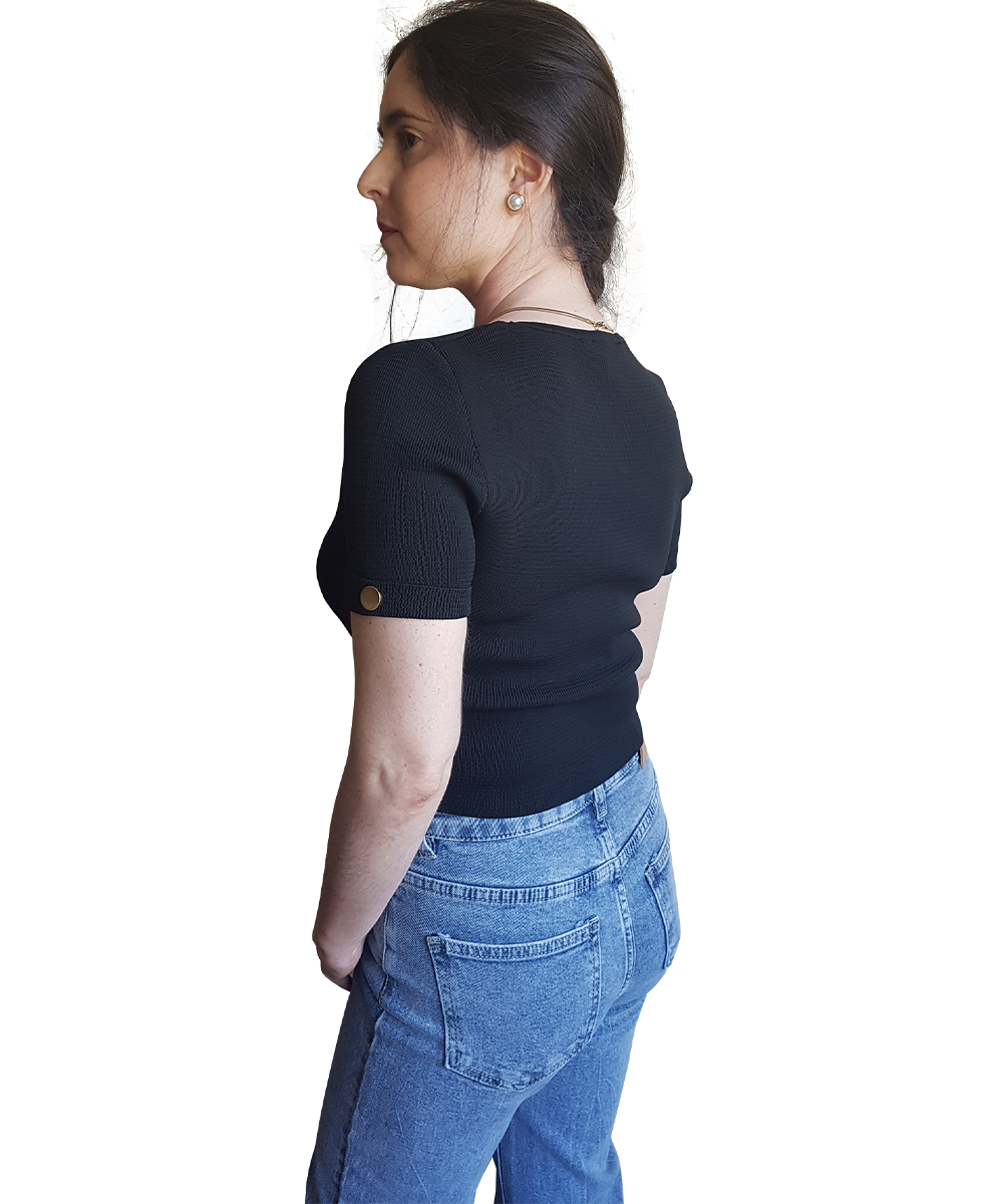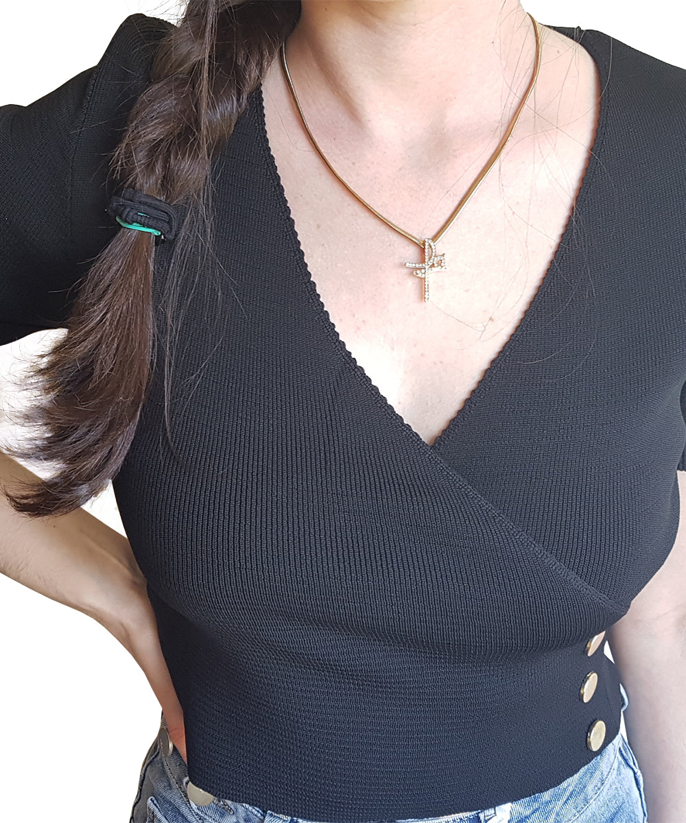 Top em malha, decote em bico cruzado. Com botões dourados na lateral e nas mangas.
