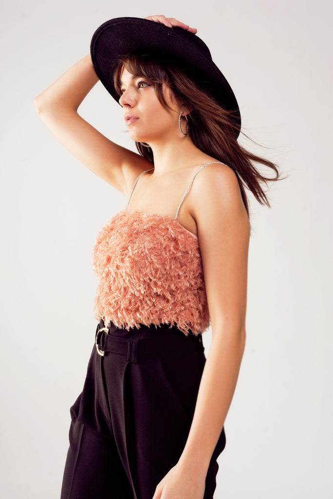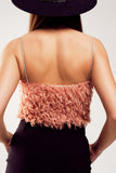 Top de cor rosa curto com plumas