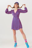 Vestido de embrulho de pescoço Mini V com impressão geométrica